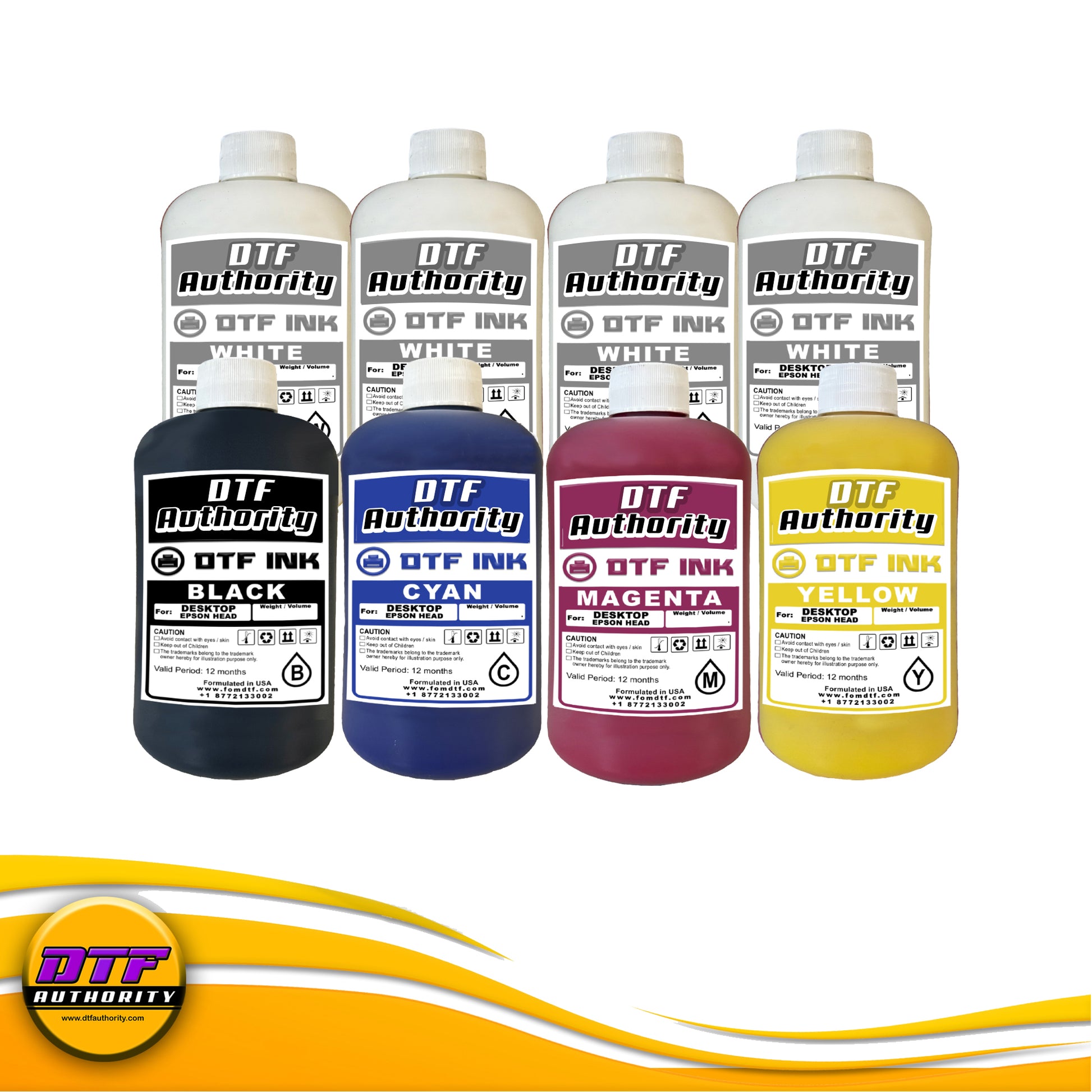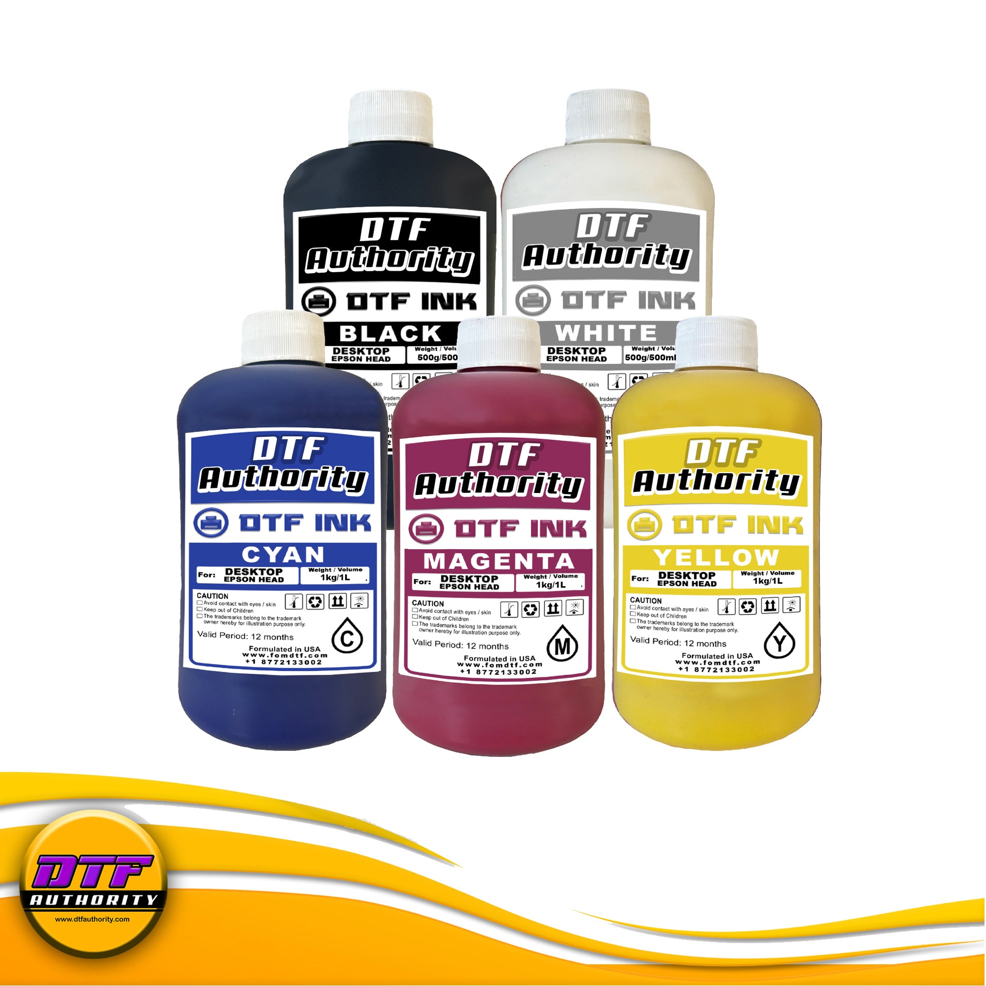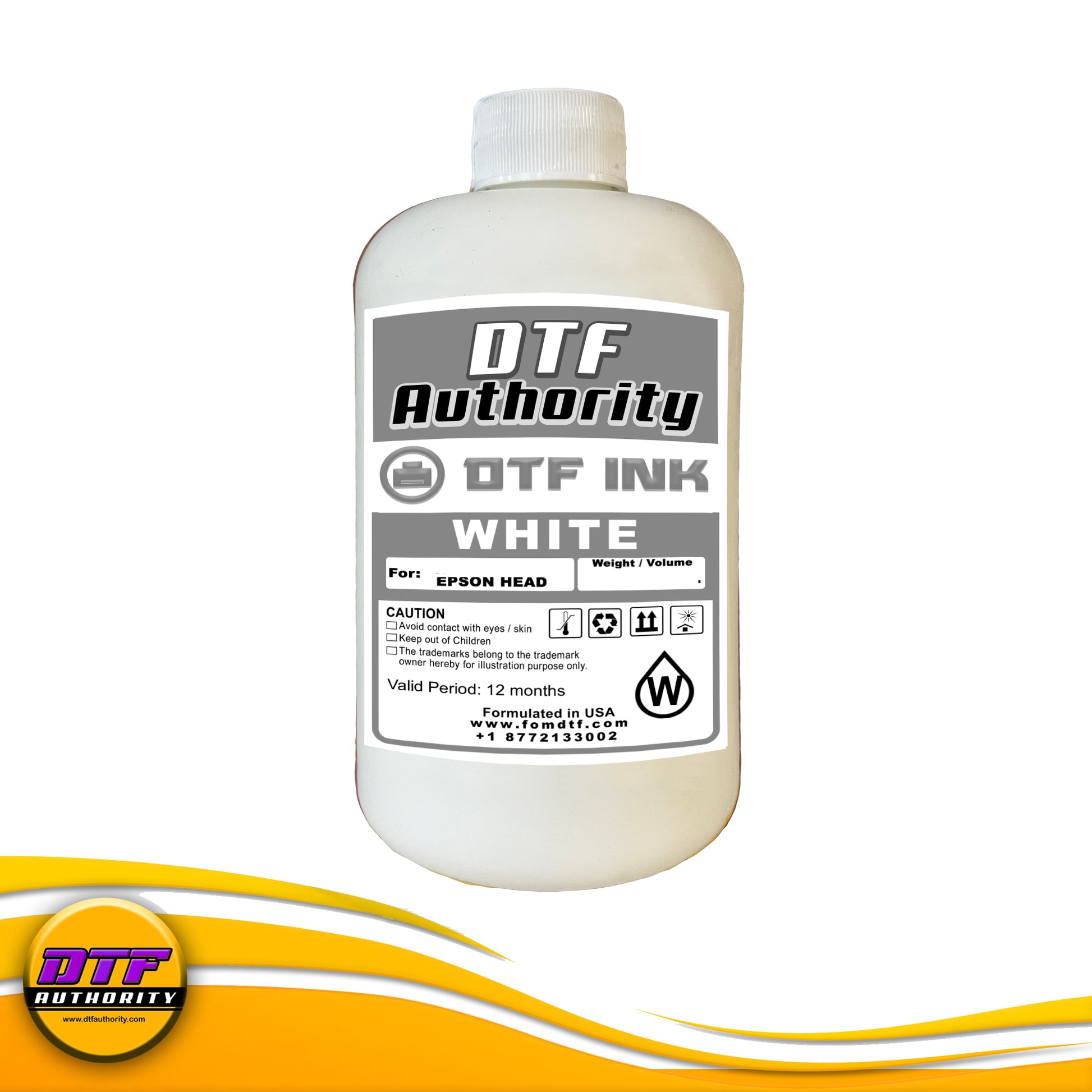 This is a bottle of Premium DTF Ink by DTF Authority that is engineered for Desktop and Wide Format Printhead.