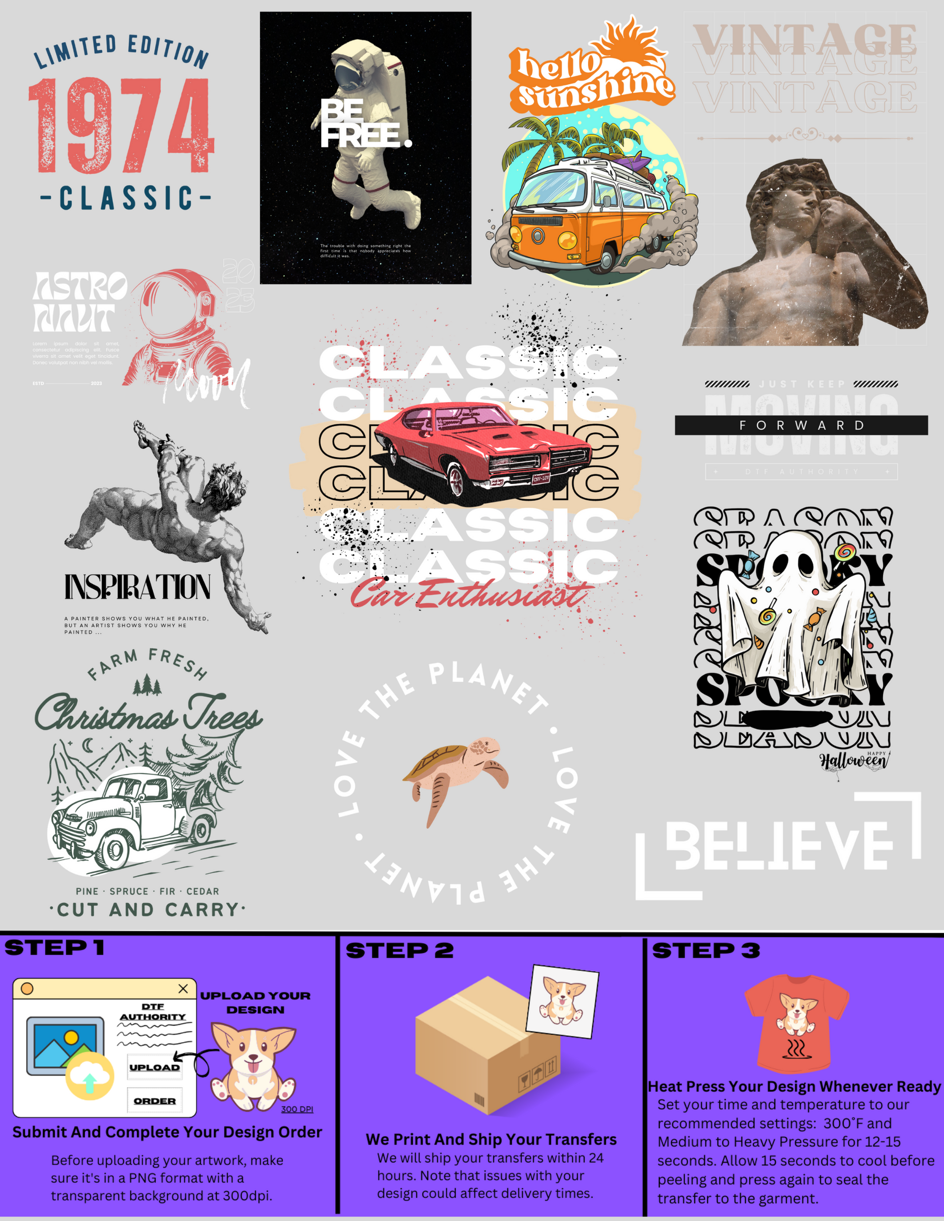 Feel the advantages of DTF transfers for yourself with our complimentary Premium DTF Transfer Sample Pack. Additionally, it comes with step-by-step application instructions and a user-friendly fabric guide for your convenience.